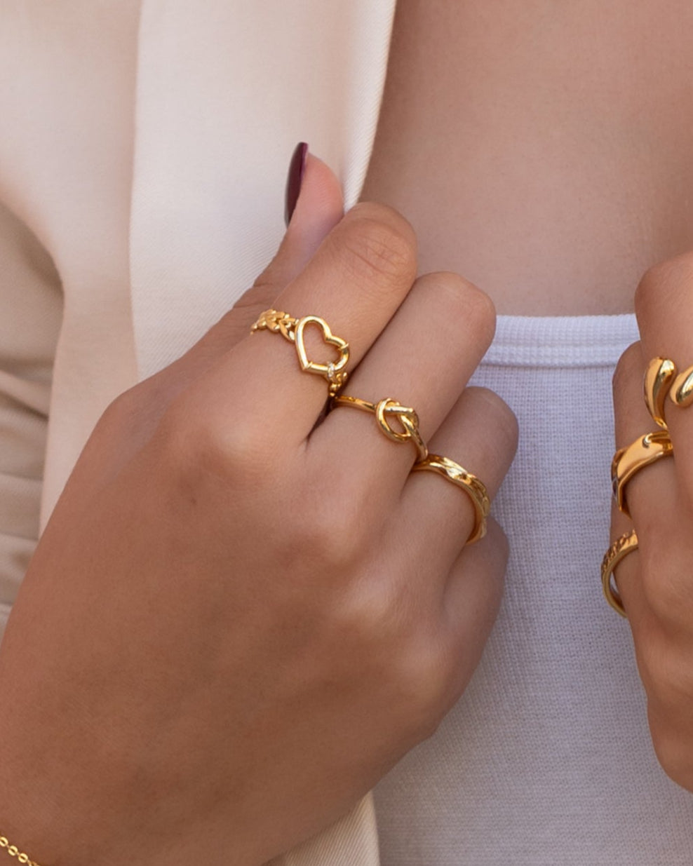 טבעת כסף או ציפוי זהב בעיצוב קשר, המציעה מראה מודרני וחדשני. העיצוב המיוחד שלה משדר ייחודיות ואומץ, והופך אותה לבחירה אידיאלית לכל אישה. טבעת זו מתאימה לשימוש יומיומי ולאירועים מיוחדים, ומשדרגת כל אוסף תכשיטים. במחיר נגיש, היא מציעה שילוב של איכות וסטייל. תוספת נפלאה שמוסיפה נופך של יופי לכל מראה!