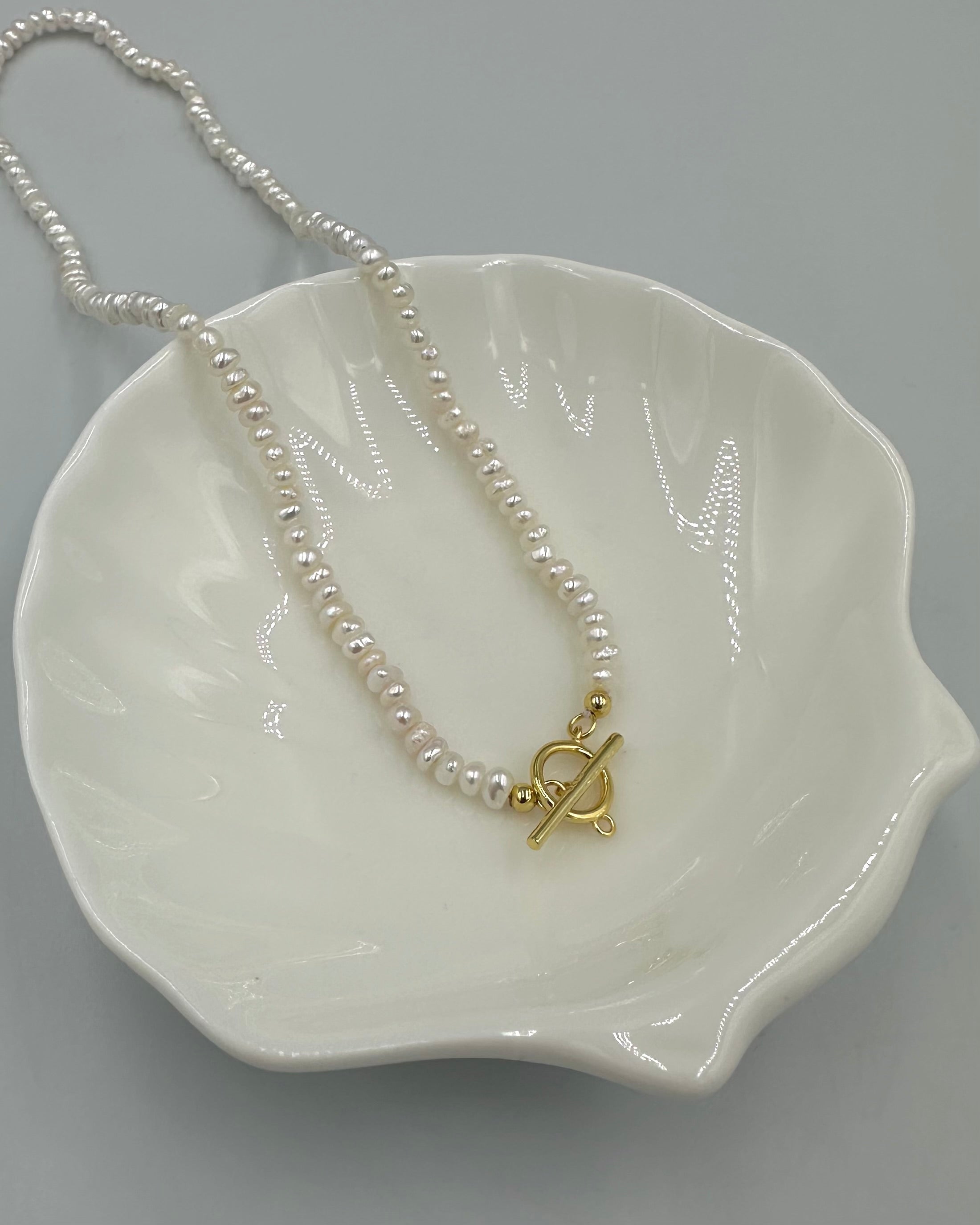 שרשרת פנינים עדינה עם סוגר מיוחד בציפוי זהב היא תכשיט שמדגיש את האלגנטיות שבפשטות. הפנינים המבריקות משתלבות זו בזו ויוצרות מראה רך ונשי, בעוד הסוגר המיוחד מוסיף טאץ' של יוקרה. השרשרת מתאימה לכל הזדמנות, בין אם ליום-יום או לאירועים מיוחדים. העיצוב הקלאסי שלה מאפשר לשלב אותה עם מגוון סגנונות לבוש. זו הבחירה המושלמת למי שרוצה להוסיף נופך של קסם לכל אאוטפיט!