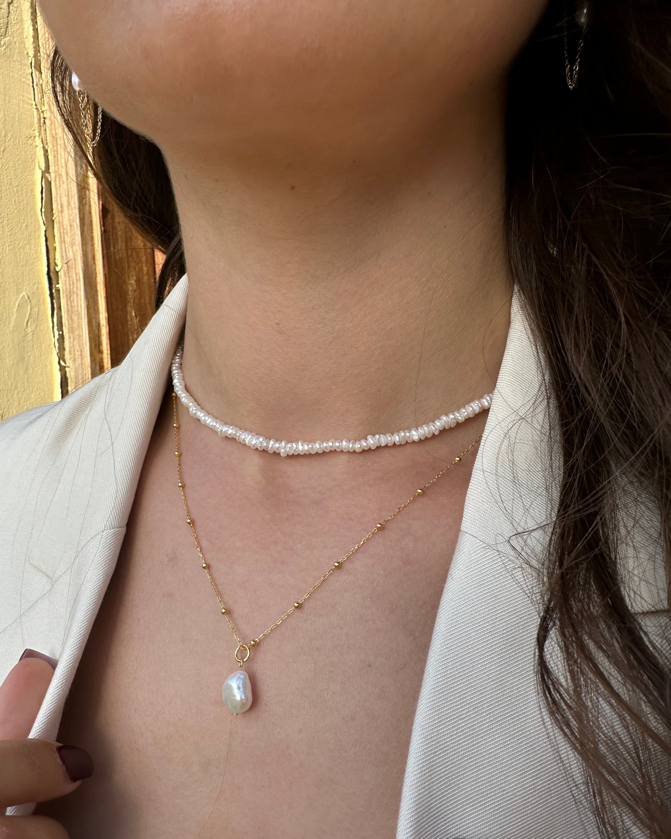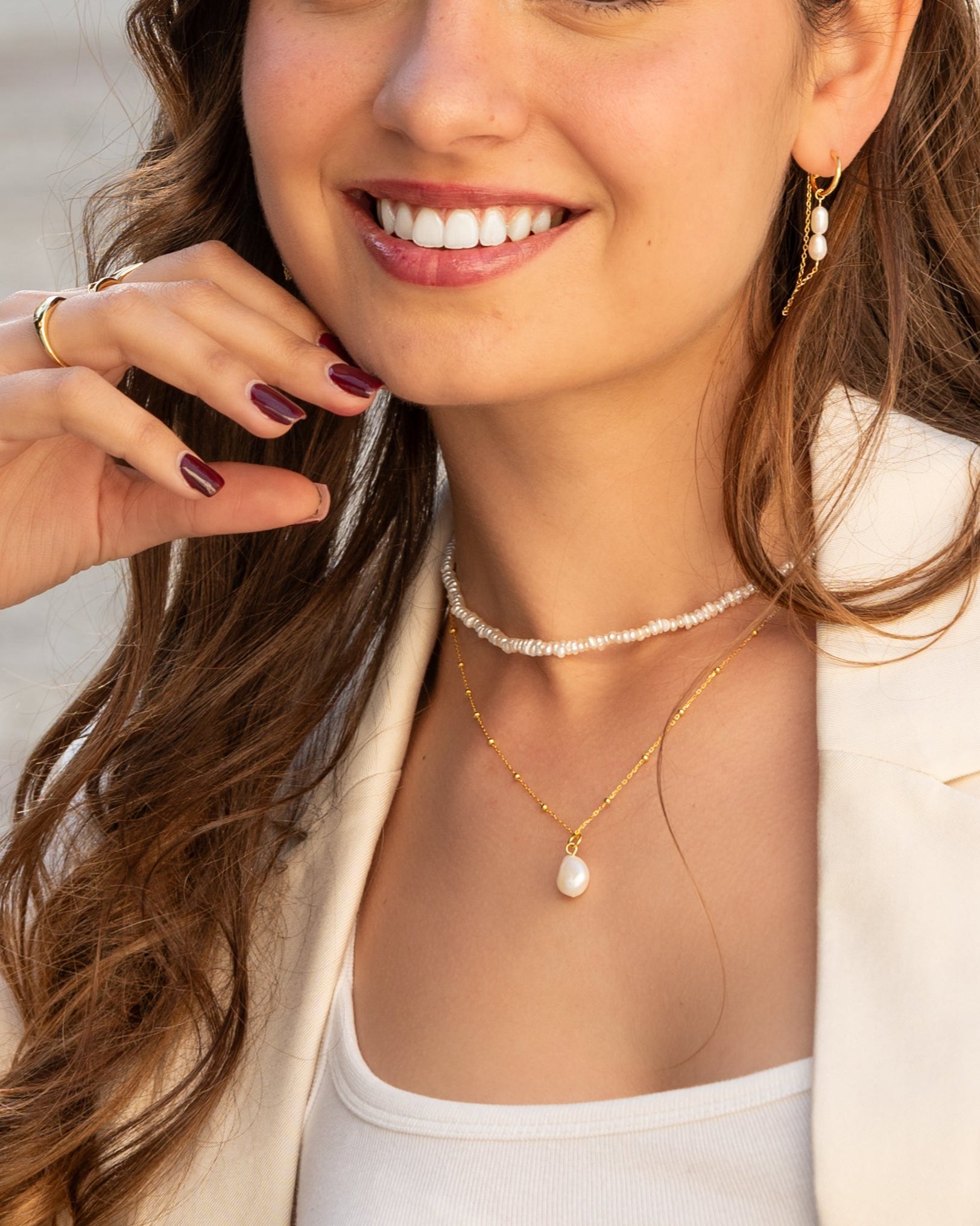 שרשרת פנינים עדינה בעלת סוגר אחורי ציפוי זהב, תכשיט קלאסי שמביא עמו נגיעה של אלגנטיות. הפנינים המבריקות והיפות משתלבות זו בזו בצורה מושלמת, יוצרות מראה רך ונשי. השרשרת מתאימה לכל אירוע, בין אם זה יום-יום או אירועים מיוחדים. עיצובה המינימליסטי מאפשר לה להתאים בקלות למגוון מראות. הבחירה המושלמת למי שרוצה להוסיף טאץ' של יוקרה לכל אאוטפיט!