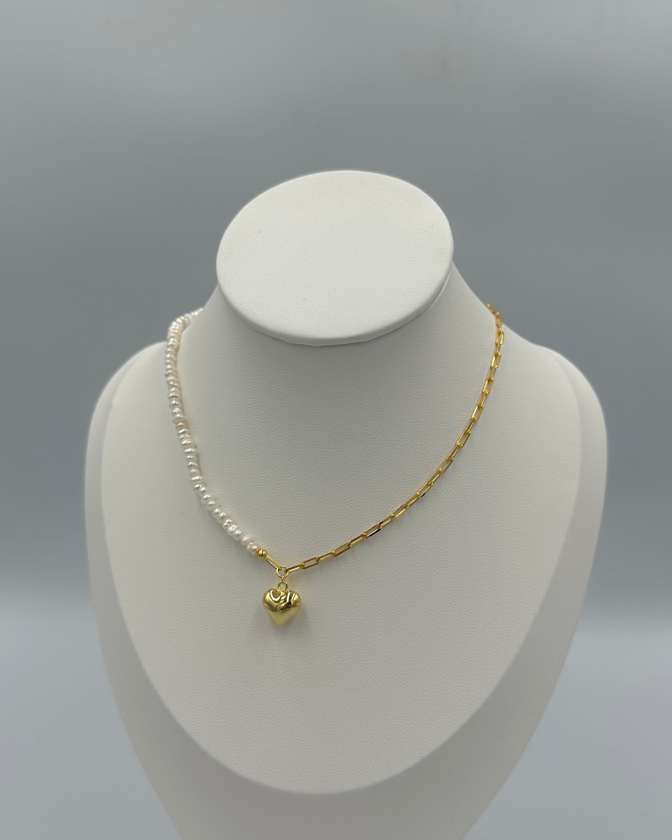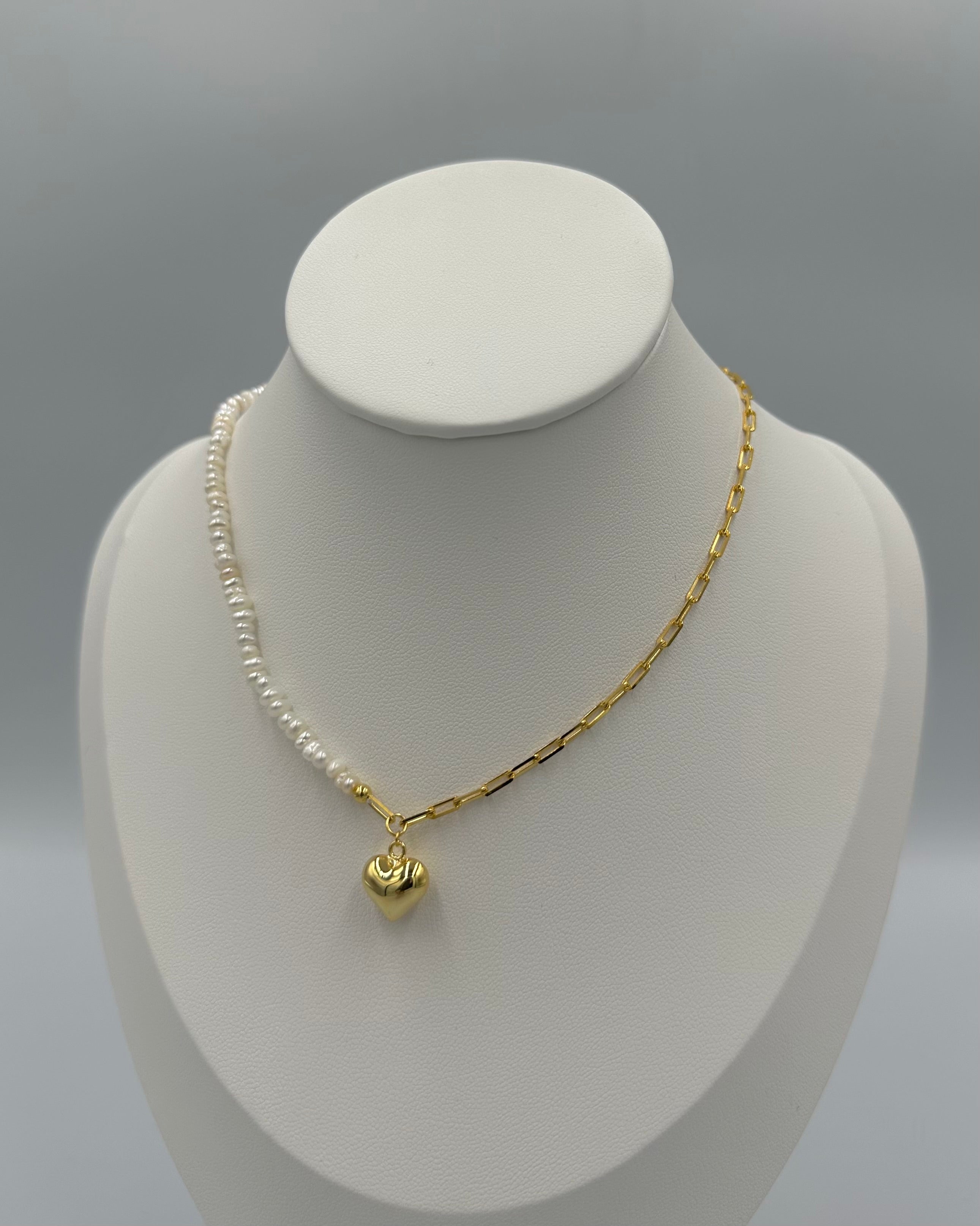 שרשרת ייחודית המשלבת חצי פנינים וחצי שרשרת חוליות ציפוי זהב שיוצרת מראה מרהיב ומיוחד. התליון בצורת לב מוסיף נופך רומנטי ונשי, מושלם למי שמחפשת ביטוי אישי. השרשרת מתאימה לכל אירוע, בין אם זה ליום-יום או לאירועים מיוחדים. העיצוב המיוחד שלה מאפשר לשלב אותה עם מגוון סגנונות לבוש. זו הבחירה המושלמת למי שרוצה להוסיף טאץ' של אהבה ואלגנטיות לכל אאוטפיט!