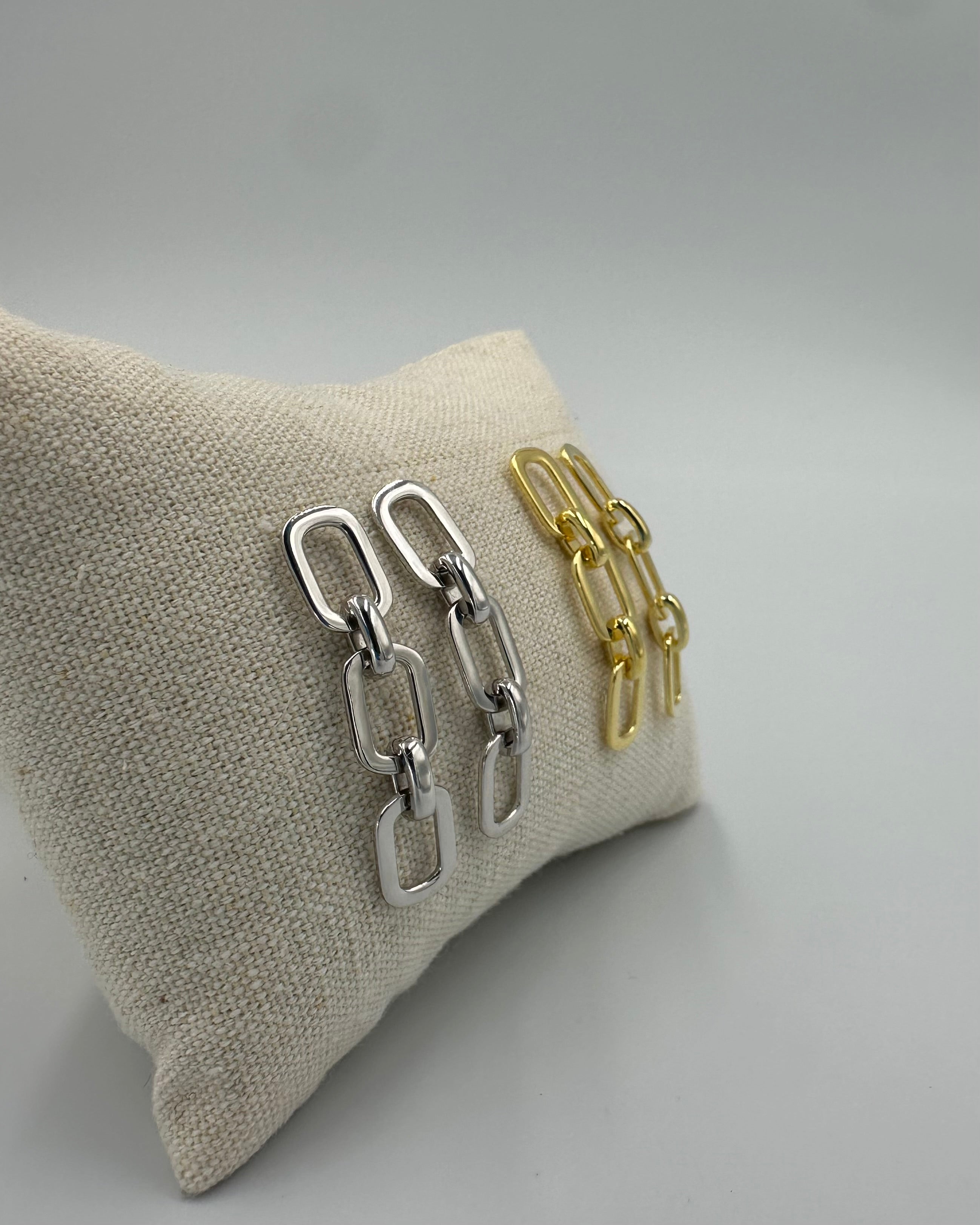 עגילי כסף או ציפוי זהב ארוכים בעיצוב של חוליות גדולות הם תוספת מרשימה לכל מראה. עם קווים דרמטיים ועיצוב ייחודי, הם מוסיפים נוכחות וביטחון. העגילים זורמים בצורה מעודנת ומושכים את תשומת הלב, מתאימים לאירועים מיוחדים וגם ליום-יום. הציפוי המבריק מדגיש את הפרטים ומקנה מראה אלגנטי וטרנדי. הבחירה המושלמת למי שרוצה לבלוט ולהתבלט!